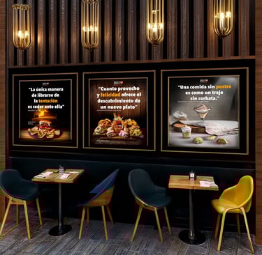 Se hicieron cerca de 100 fotografías de diferentes productos, platos principales, postres, pata de ternera y cerdo estilo burguer para carta y se elaboraron carteles promocionales de los más destacados para el público acompañados de frases de personas con una autoridad en su trabajo, buscando anclar el concepto de la frase a la experiencia del cliente con el producto a degustar.